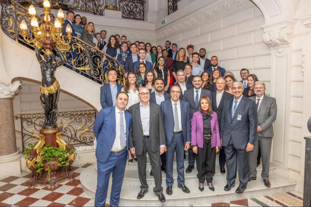 Sabeur Sassi front and centre, flanked on the left by Omar Bouhadiba, CEO of NBK's international banking group, and Sheikha Al-Bahar, deputy group CEO, on the right. Positioned behind and to the right of Al-Bahar is Florent Richard. They gather on an ornate staircase for a meeting in 2024. (Image from NBK France's LinkedIn page)